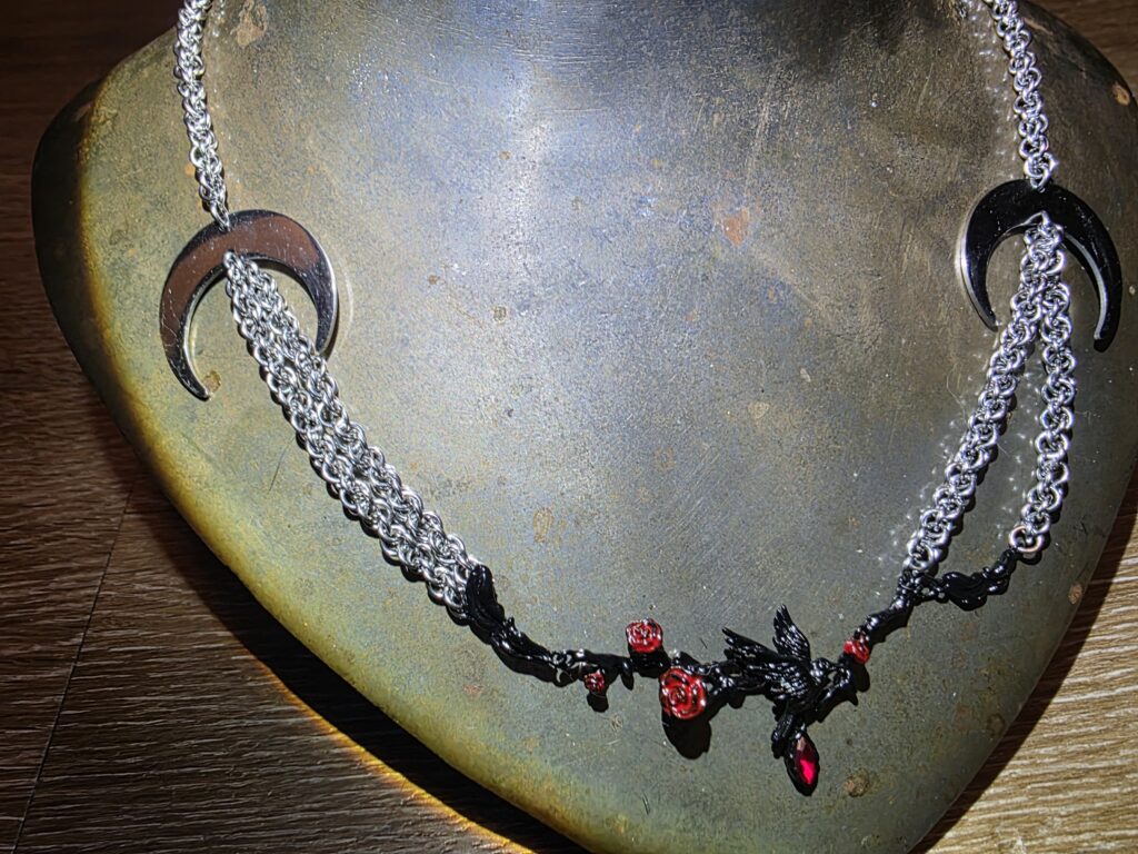 Custom crow necklace with crescent moons. The pendant is a crow with roses and feathers.