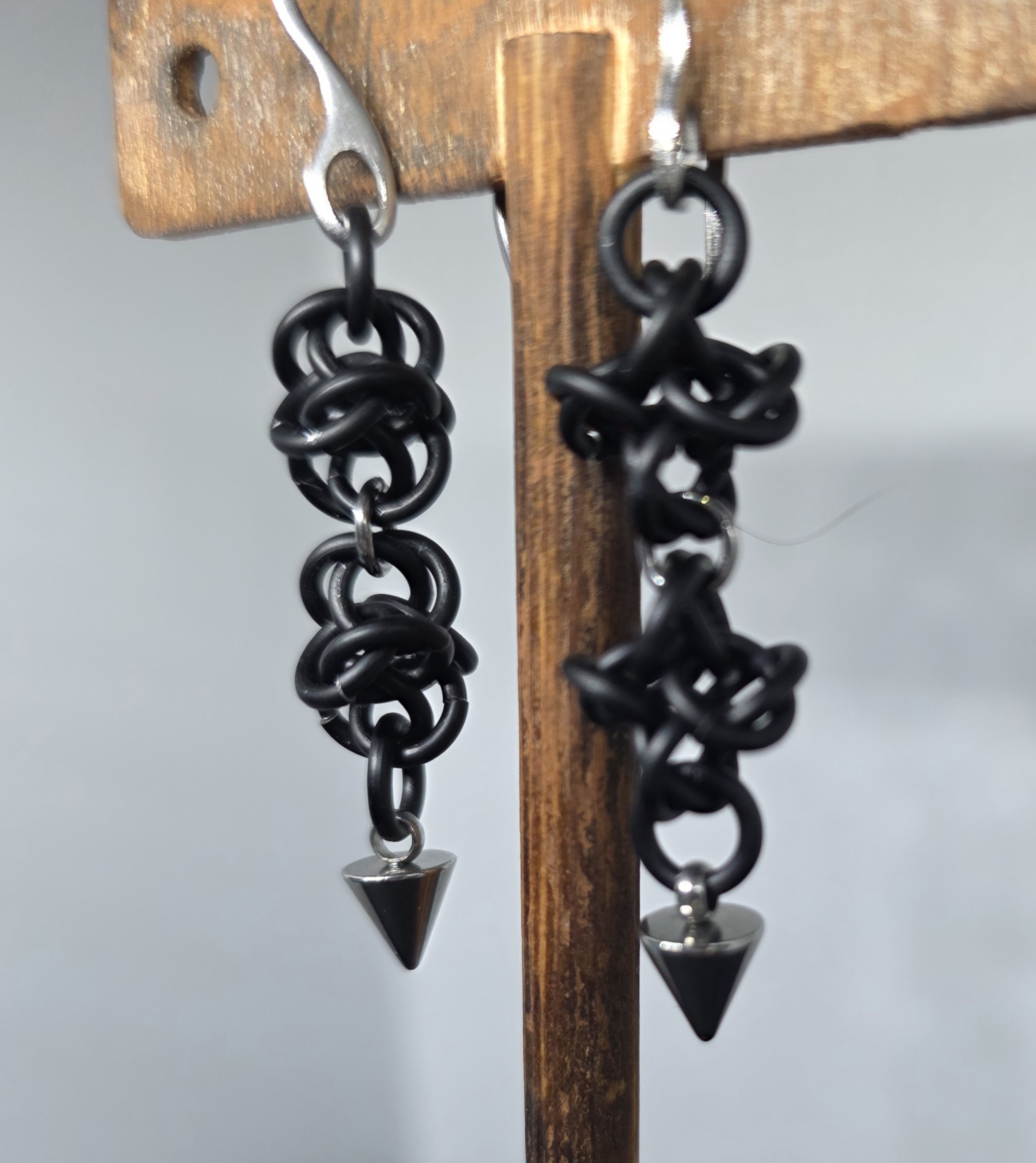 These mate black eaarings have 304 stainless steel earring hooks and stainless steel spikes. The chainmaille weave for them is intricate and enchanting, with an almost Celtic weave type of design.