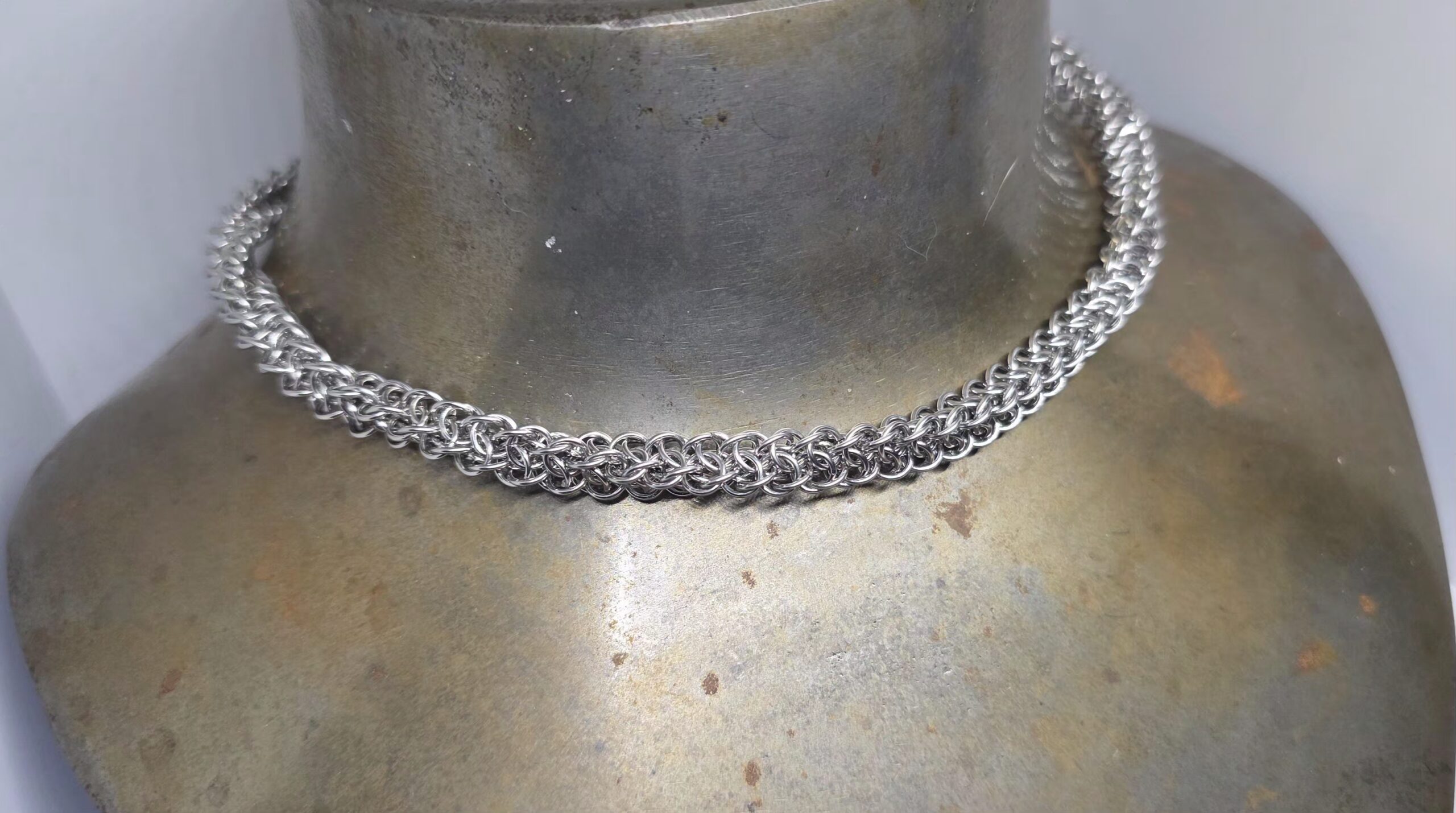 This stainless steel necklace is 16.5 inches of twisting triforce weave with a black clip clasp. This weave is shaped like a triangle, making it a wonder to view. The weave is very unique, with a very pleasing texture, and will definitely stand out from the crowd. There are extra rings to make the length more adjustable.